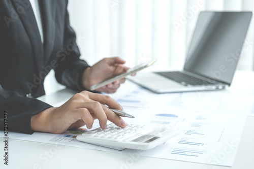 businesswomen bookkeeper use calculator and laptop doing account for paying tax on white desk in working office