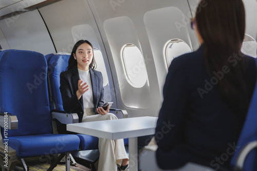 Businesswomen having a conversation on a private jet flight