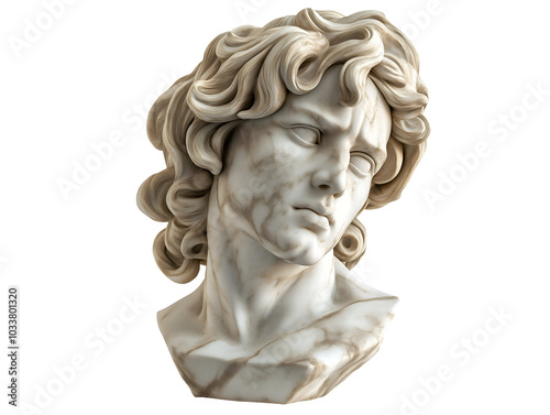 bust of alexander the great with flowing hair and intricate marble details on isolated background
