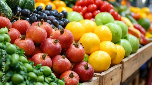 Bustling fruit stand brimming with vibrant produce showcasing a variety of fresh fruits in an open market environment