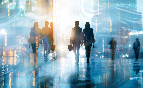 Bustling Urban Scene of People Commuting During a Vibrant Sunset