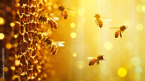 Busy Bees Working at Golden Honeycomb, Bright Sunlight, Copy Space on Yellow Background