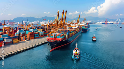 Busy cargo port with large container ships and tugboats navigating water. vibrant colors of containers create striking visual against blue sky and sea