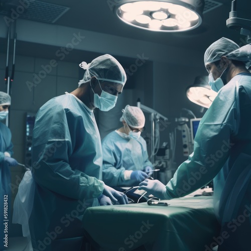 Busy caucasian surgeons with face masks preparing at surgery, created using generative ai technology