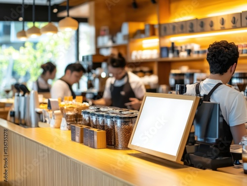 Busy Coffee Shop Interior with Diverse Baristas in Action Serving Customers