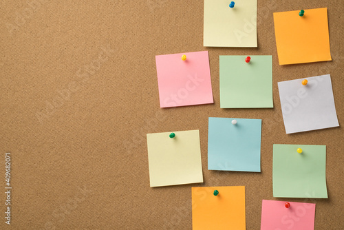 Busy day at work concept. Photo of lot of colorful notepaper attached with pins to the wooden board