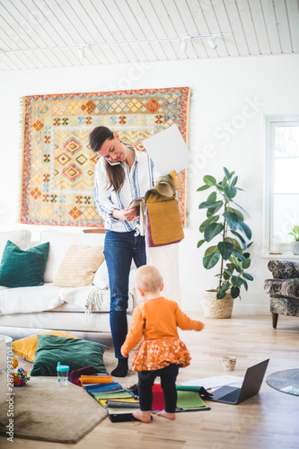 Busy freelancing designer answering smart phone while holding fabric swatch by daughter in living room at home office