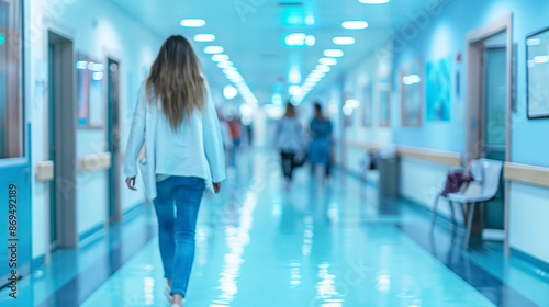 Busy Hospital Corridor with Medical Staff and Patients in Motion, Blurred Background