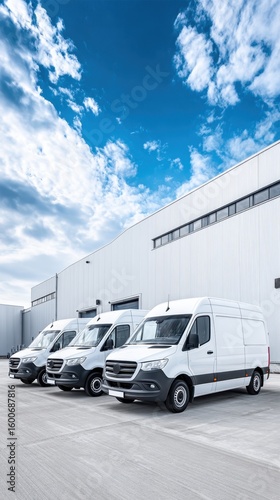 Busy Logistics Center with Delivery Vans Parked in Front of Warehouse Wall - Commercial Transport and Shipping Concept with Copy Space