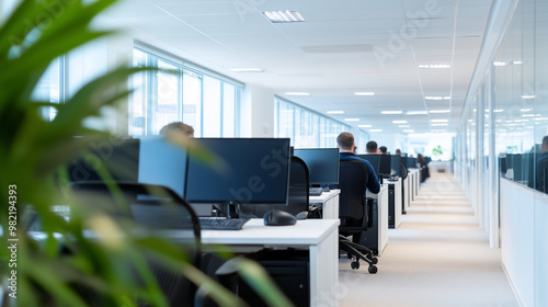 Busy office with people working in cubicle-style workstations, modern and bright design, productive atmosphere, teamwork, copy space