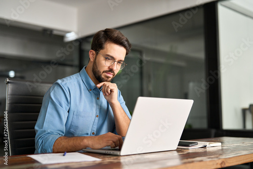 Busy professional business man company employee, young male programmer, latin businessman looking at computer thinking on online investment or software development using laptop working at office.