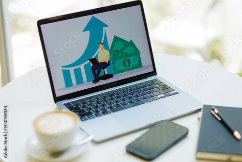Busy professional workspace featuring a laptop, documents, and financial charts — ideal for themes such as data analysis, accounting, and digital business strategy.
