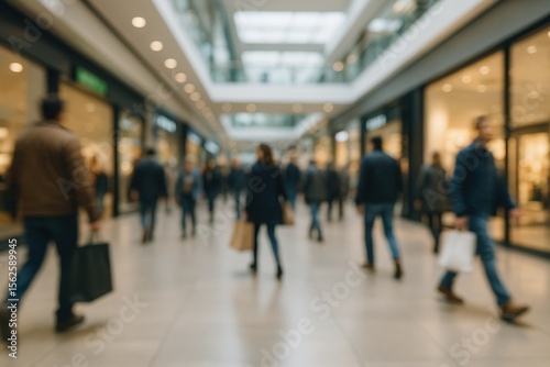 Busy shoppers browsing retail merchandise in modern shopping center with natural lighting