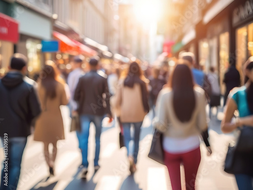 Busy shopping street during city rush hour. Blurred. Sunlight shining.