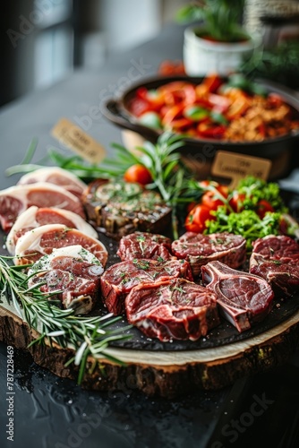 Butcher shop meat cuts display on wooden tray with empty price tags for copy space, wide banner