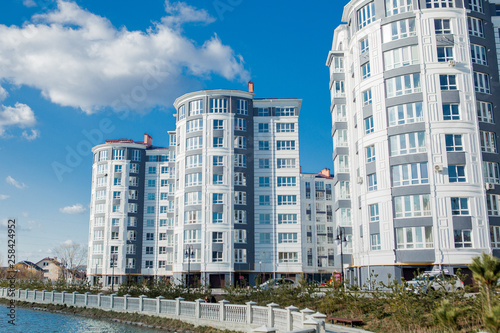 Butovo district, new building, panoramic view into the territory near the house, new houses, building, architecture, park and lake. Autumn and beautiful, cumulus clouds