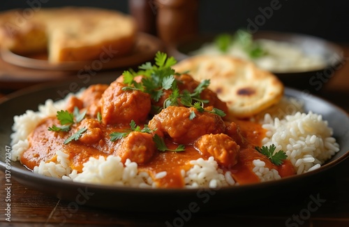 Butter chicken served with white rice, naan bread, coriander garnish on a dark plate. Indian cuisine, meal, dinner. Spicy and delicious food. Popular dish at restaurant.