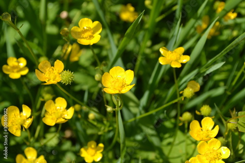 Buttercup caustic, common type of buttercups. Rannculus acris. Field, forest plant. Flower bed, beautiful gentle plants. Sunny summer day. Yellow flowers