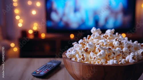 Buttered popcorn in a rustic bowl with blurred TV screen and cozy living room ambiance featuring warm lighting