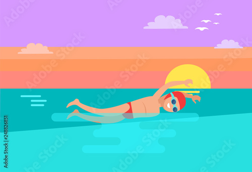 Butterfly swimming style vector. Stroke performed by sportsman in sea water in evening. Sunset and flying seagull birds in sky, professional sport