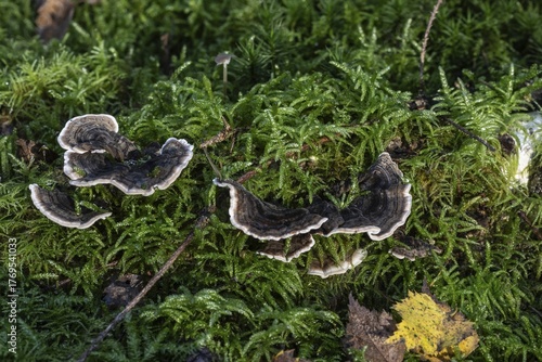 Butterfly Trametes (Trametes versicolor) in moss, Emsland, Lower Saxony, Germany