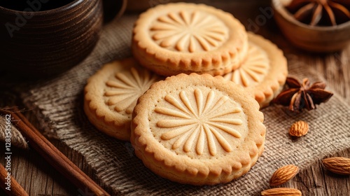 Buttery cookies, cinnamon, almonds, coffee, rustic setting, food photography