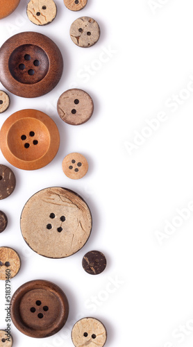 Button isolated on white background with copy space. Wooden buttons collection isolated