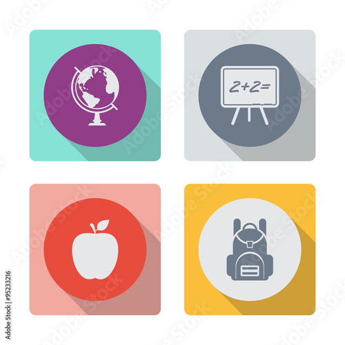 Buttons with shadow. Globe vector icon. Blackboard vector icon. Apple vector icon. School backpack vector icon.