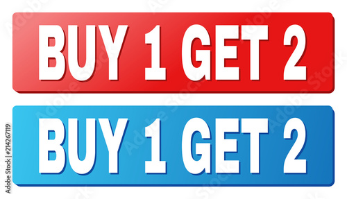 BUY 1 GET 2 text on rounded rectangle buttons. Designed with white caption with shadow and blue and red button colors.