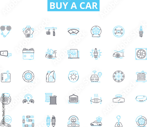 Buy a car linear icons set. Purchase, Vehicle, Auto, Automobile, Transport, Drive, Investment line vector and concept signs. Status,Upgrade,Budget outline illustrations Generative AI