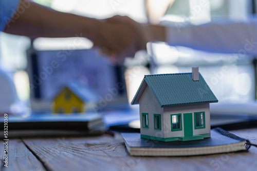 Buyers and real estate agents agree to trade in handshake to rent or buy a home after signing a contract. Businessman congratulates buyer after agreeing to insure and buy house project, insurance