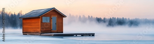 Cabin on Frozen Lake, Misty Forest Backdrop, Winter, Landscape
