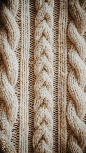 Cable knit texture close up. Woven strands display detailed, soft, cozy pattern