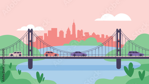 Cable- Stayed Bridge with City Skyline and Evening Sky