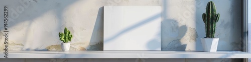 Cactus and blank canvas displayed on a shelf