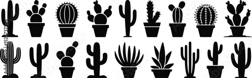 Cactus plant silhouette vector set, indoor succulent icon collection, potted desert plant graphic, black cactus illustration