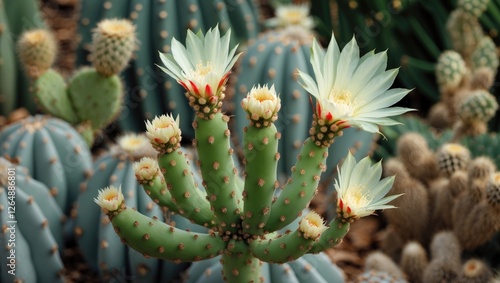 Cactus plant with multiple arms and blooming flowers in a desert garden with various cactus species in the background Copy Space