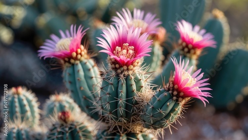 Cactus with pink flowers blooming on the spiny stems, close-up shot.