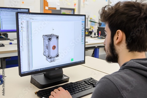 CAD designer meticulously crafting intricate models, blending technical precision with innovative design concepts, showcasing advanced drafting skills.