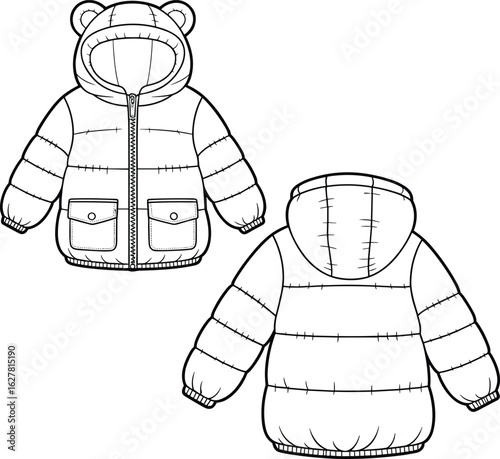 CAD Drawing Flat Vector Illustration, Children’s Winter Jacket with Bear Ears, Front and Back View, Cute Hooded Outerwear, Fashion Sketch