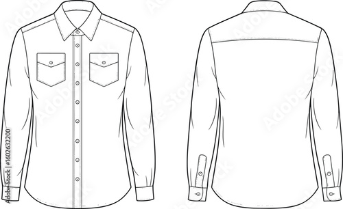 CAD drawing flat vector illustration of button-up shirt design, stitched pocket detail, cuffed sleeves, fashion layout, front and back viewsCAD drawing flat vector illustration of