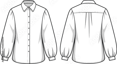 CAD drawing flat vector illustration of button-up shirt, long sleeves, front back view, fashion sketch, garment template, technical layout, shirt design, clothing vector