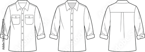 CAD drawing flat vector illustration of classic button-up shirt with rolled sleeves, front back views, pockets, stitching details
