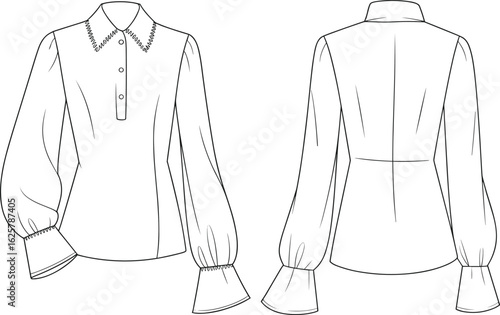 CAD Drawing Flat Vector Illustration of Garments Dress, Long Sleeve Blouse with Flared Cuffs and Collar, Garments Cloth, Fashion Template