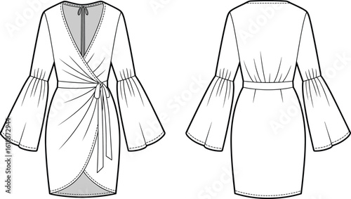 Cad Drawing Flat Vector Illustration, Wrap Dress with Bell Sleeves, Fashion Sketch, Front and Back View, Clothing Design Template