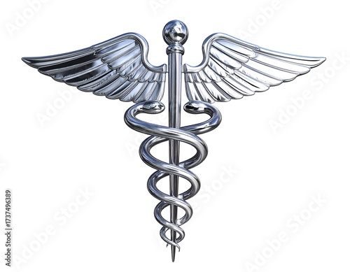 Caduceus medical symbol with two snakes and wings, silver color, isolated on white background.