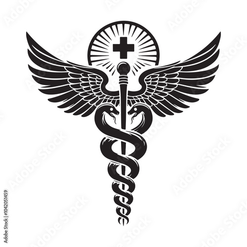 Caduceus Symbol (Staff with Two Snakes) silhouette vector black color white background