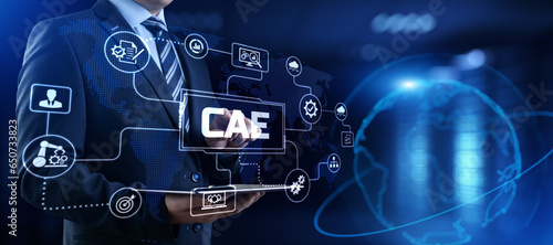 CAE Computer-aided engineering software system concept. Businessman pressing button on screen.