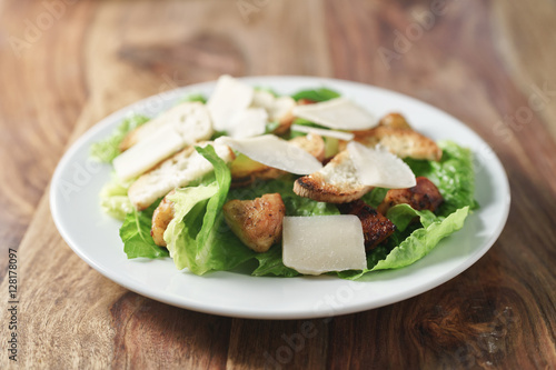 caesar salad with chicken on wood table mediterranean food, shallow focus