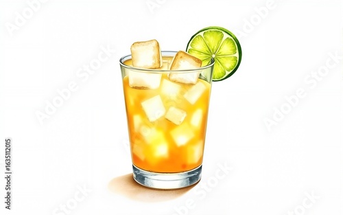 Caipirinha cocktail with ice cubes and lime slice in a short glass. Watercolor illustration on white background. Traditional Brazilian drink with lime. High quality